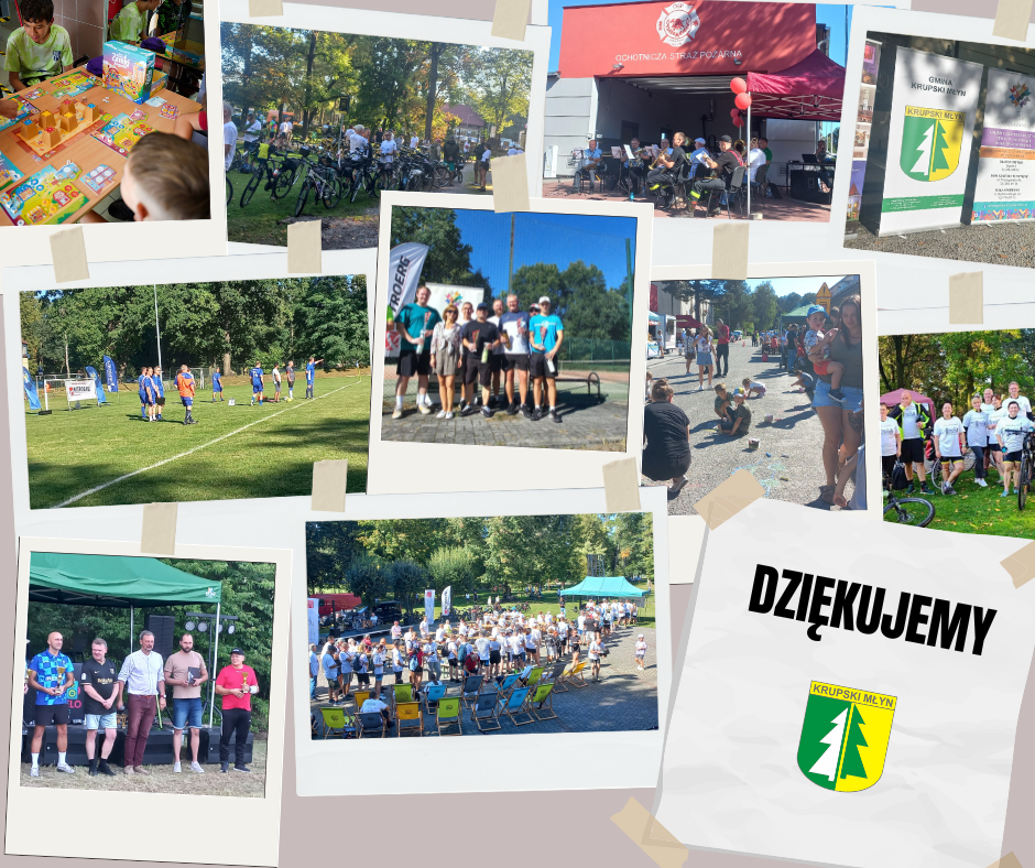 Chcielibyśmy z całego serca podziękować wszystkim, którzy przyczynili się do organizacji tych wydarzeń, w szczególności Gminnemu Ośrodkowi Kultury, Sportu i Rekreacji w Krupskim Młynie, drużynie Nitron Krupski Młyn, CEKUŚ Centrum Kultury Śląskiej w Nakle Śląskim, Fantastycznej Krupie, Ochotniczej Straży Pożarnej w Krupskim Młynie, osobom zaangażowanym w przygotowania, stowarzyszeniom, instytucjom, organizacjom i wolontariuszom. Dzięki Waszej pracy i poświęceniu każdy moment przebiegał sprawnie i w przyjaznej, radosnej atmosferze.