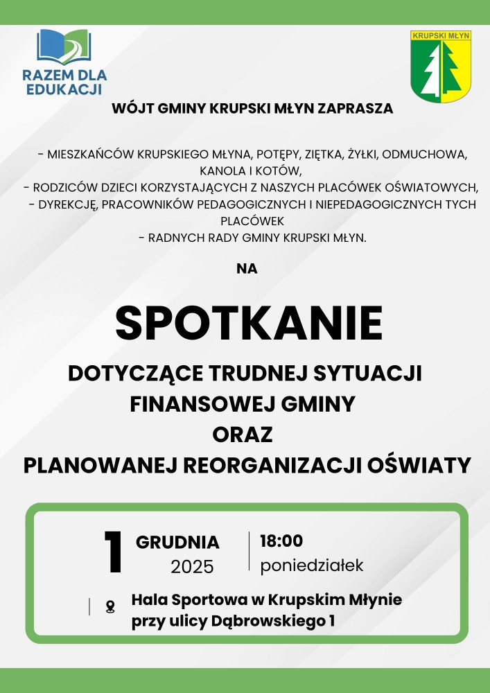 Wójt Gminy Krupski Młyn zaprasza mieszkańców na spotkanie dotyczące trudnej sytuacji finansowej gminy oraz planowanej reorganizacji oświaty
